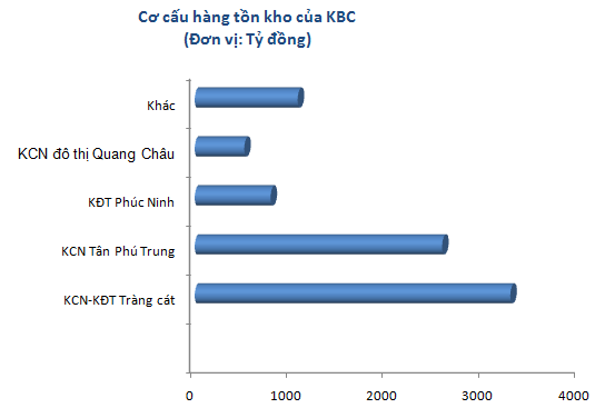 Hàng tồn kho của KBC tập trung chủ yếu ở chi phí xây dựng dở dang tại các dự án xây dựng khu công nghiệp và nhà thu nhập thấp trong đó lớn nhất là dự án KCN và KĐT Tràng Cát (3.282 tỷ đồng), dự án KCN Tân Phú Trung (2.572 tỷ đồng).