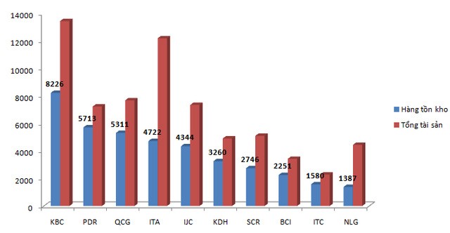Tính đến 30/9/2015, 10 ông lớn BĐS được niêm yết trên sàn chứng khoán có khoản tồn kho lên đến gần 40.000 tỷ đồng, đa phần các tài sản này đều là chi phí xây dựng dở dang tại các dự án BĐS doanh nghiệp đang thực hiện.