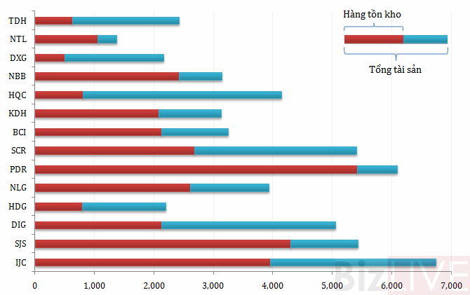 Thống kê 15 doanh nghiệp bất động sản có vốn hóa thị trường lớn trong ngành cho thấy, tính đến thời điểm 31/12/2014, tổng giá trị hàng tồn kho khoảng 43.314 tỷ đồng, tương ứng chiếm tới 30% tổng tài sản (năm 2013 là 38%).