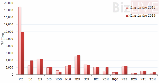 Trên thực tế, có tới 10/15 doanh nghiệp có hàng tồn kho tăng trong 2014. Tuy nhiên, nhờ giá trị hàng tồn kho của Vingroup (VIC) giảm 37% nên đã kéo tổng tồn kho của 15 doanh nghiệp này giảm nhẹ 9% so với đầu năm.