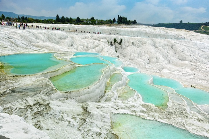 Nhìn từ xa, trườn đồi Pamukkale như được phủ một lớp tuyết trắng xóa, song thực ra đó là các mảng đá vôi trắng tinh được tạo nên từ hàng nghìn năm trước. Nước suối đọng lại ở các lớp đá vôi tạo thành các “hồ” nhỏ với mực nước chỉ khoảng nửa mét, trong suốt và xanh ngắt.