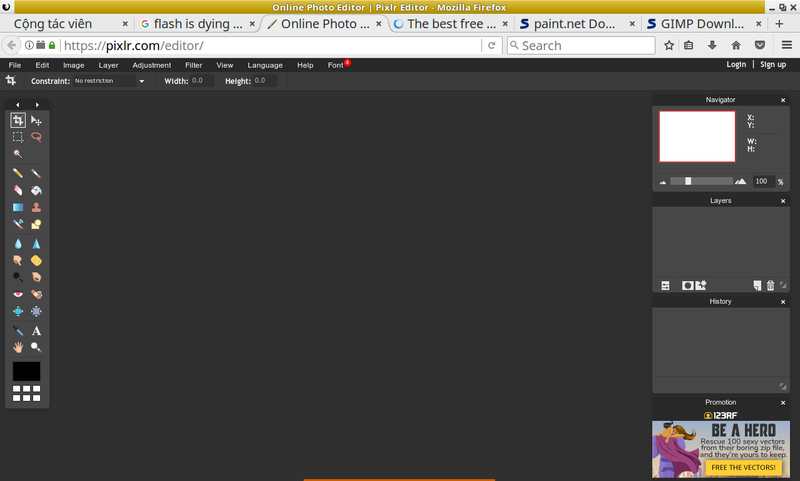 Pixlr Editor có một ad-on nổi tiếng ở góc phải màn hình để giới hạn quy mô không gian làm việc của bạn (tuy nhiên đây cũng là nhược điểm chính của nó).