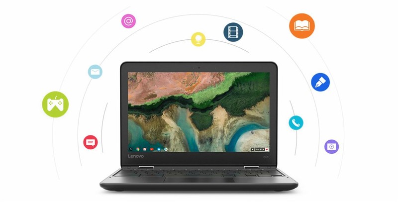 Lenovo 300e có thiết kế viền bằng cao su, nhiều cổng kết nối, bản lề linh hoạt, bàn phím chống tràn, được cài đặt hệ điều hành Chrome OS.