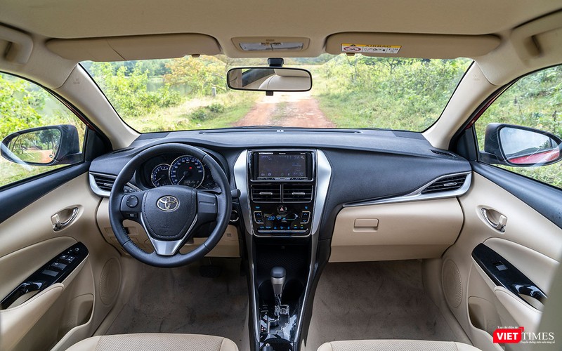Toàn bộ bề mặt bảng táp-lô là sự hiện diện của vật liệu nhựa cứng với các đường giả chỉ khâu chạy bao quanh khu vực bảng điều khiển trung tâm. Sự kết hợp giữa các mảng màu đen, xám bạc và vang be tạo cho khoang lái của Vios 2018 có được cảm quan về sự rộng rãi và cabin được xây dựng chất lượng cao.