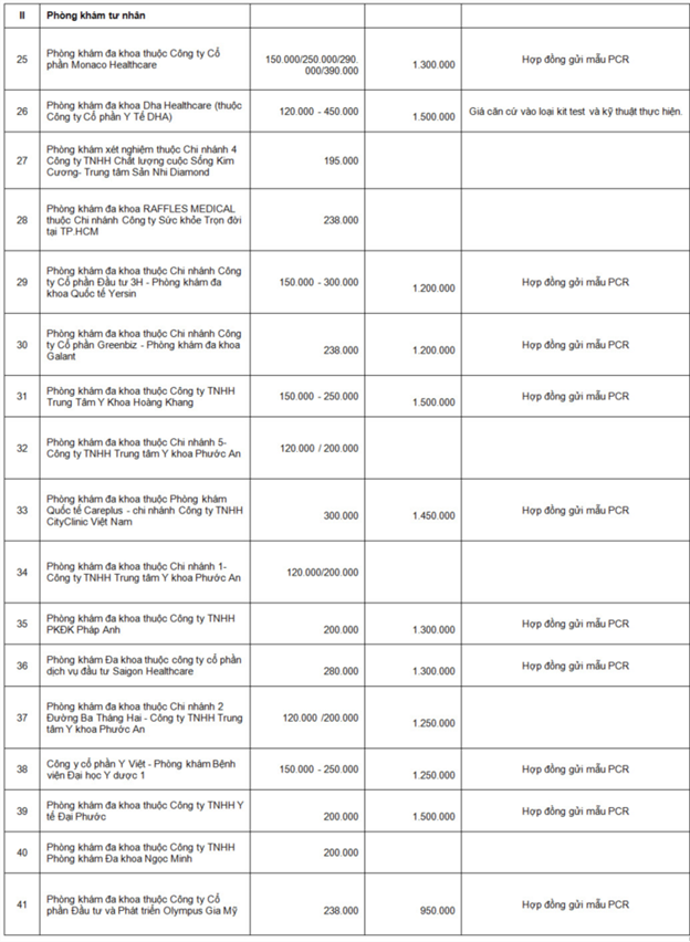 Dưới đây là danh sách bảng giá xét nghiệm tại các cơ sở y tế công lập và tư nhân đã báo cáo về Sở Y tế: