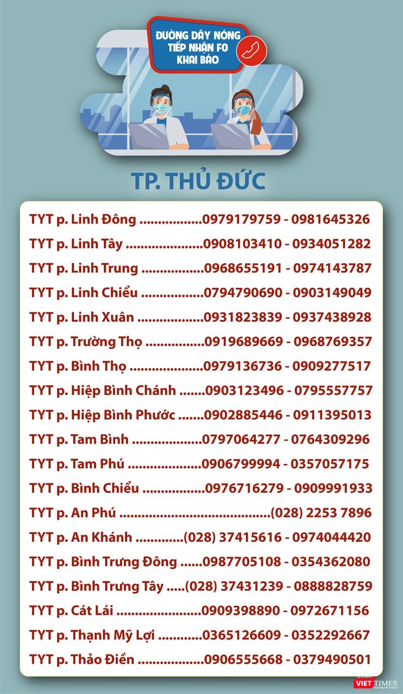 Danh sách cụ thể các Trung tâm y tế tiếp nhận F0 ở các quận, huyện, danh sách cụ thể có đăng trên trang web của HCDC và dán thông báo tại tất cả các Trung tâm y tế phường. Cụ thể, có các Hot line sau đây sẵn sàng cập nhật tình hình F0 trên địa bàn TP.HCM.