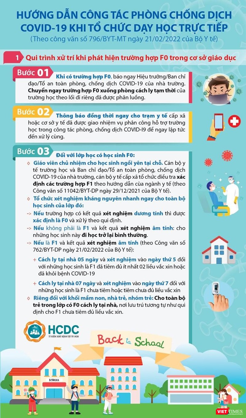 Trung tâm Kiểm soát Bệnh tật TP.HCM (HCDC) cũng cho hay, Bộ Y tế hôm 21/2/2022 đã ban hành hướng dẫn xử lý F0 trong trường học với quy định mới về thời gian cách ly F1.