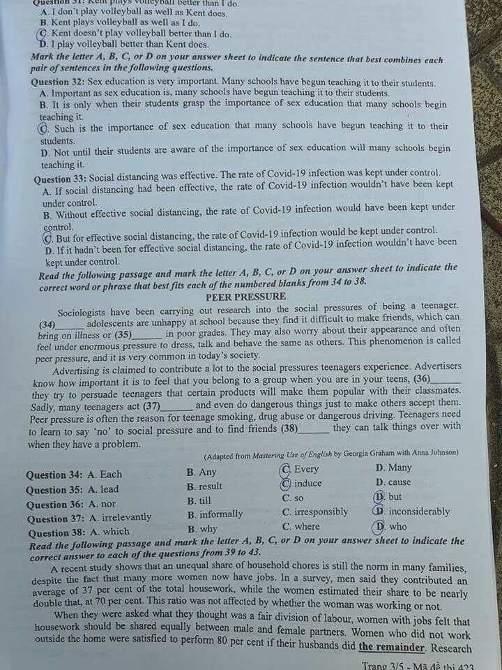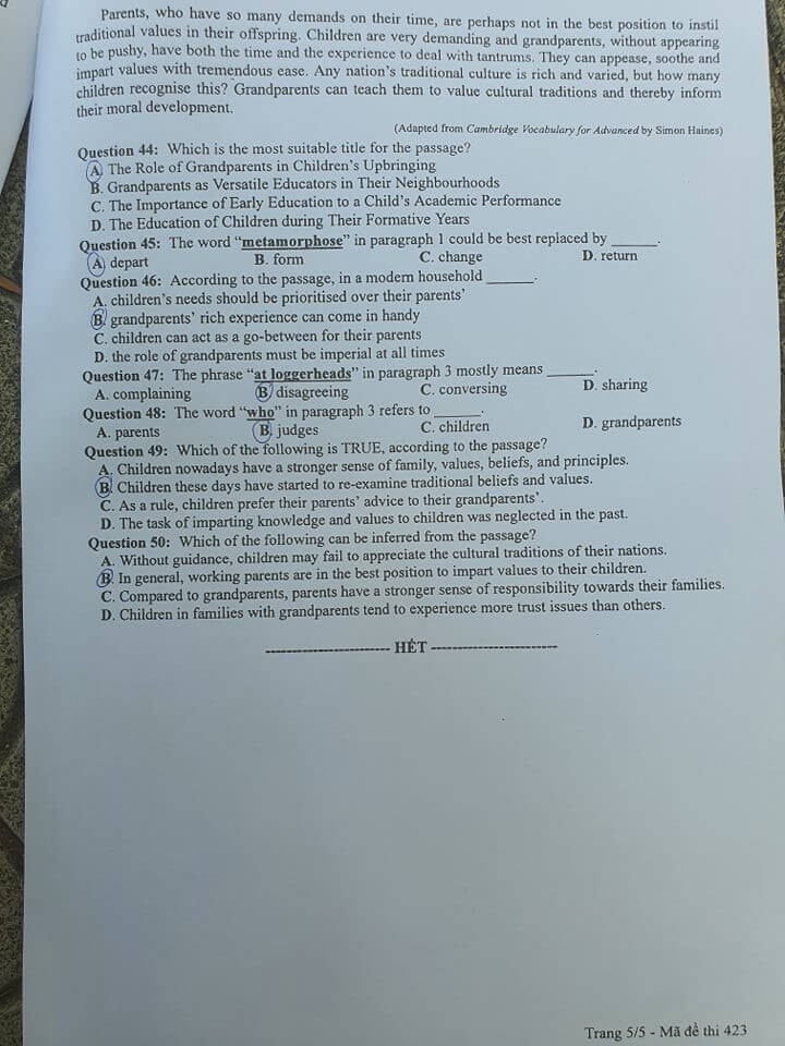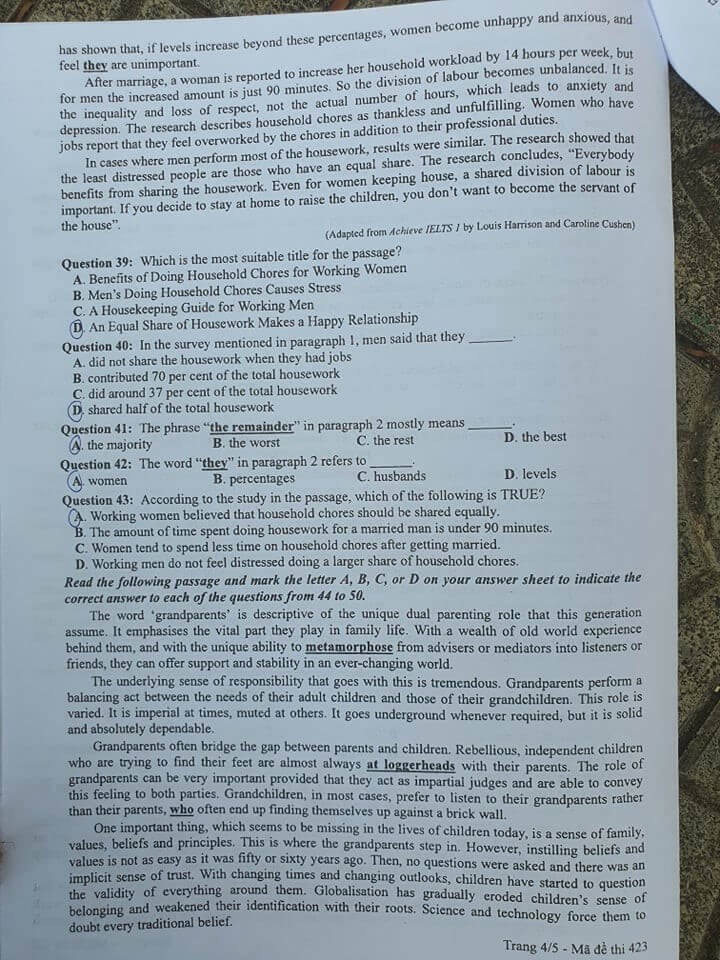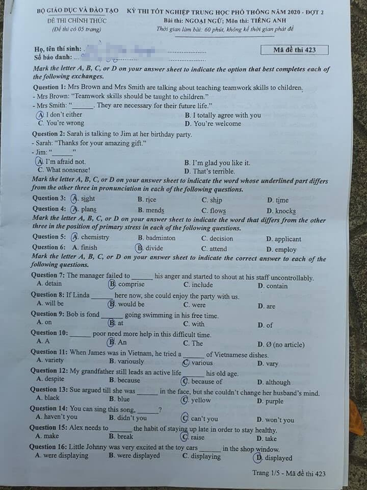 Đề thi tiếng Anh THPT 2020 đợt 2 mã đề 423: