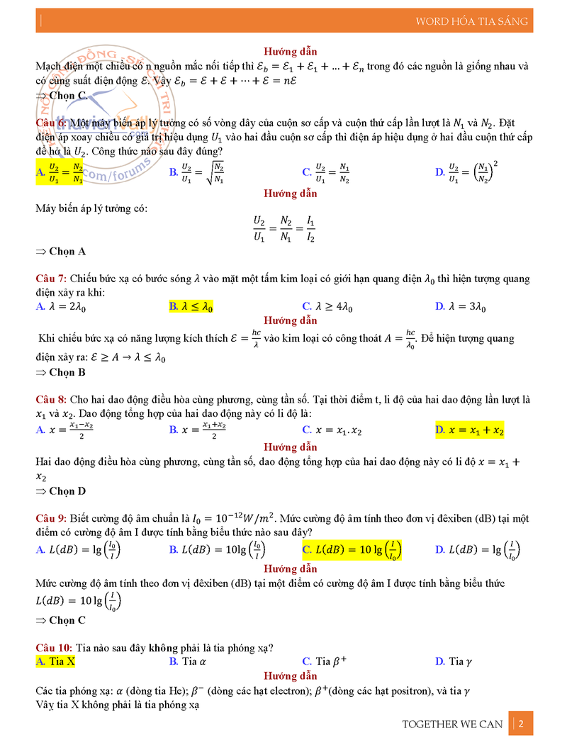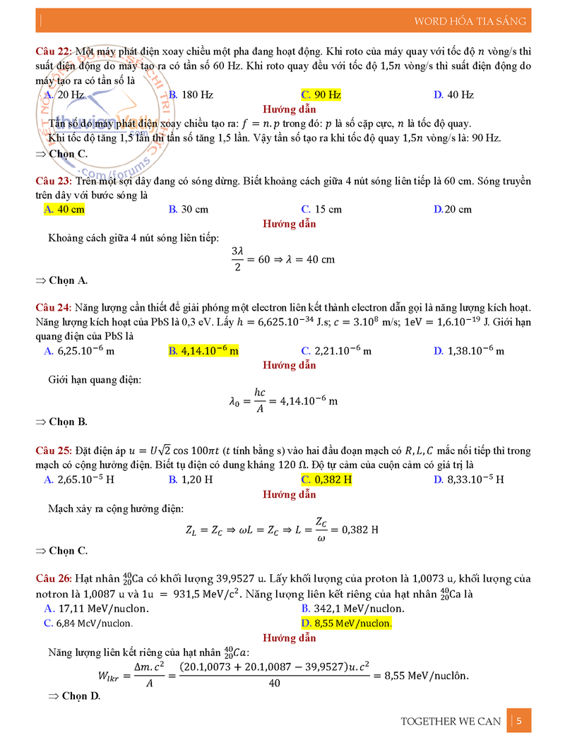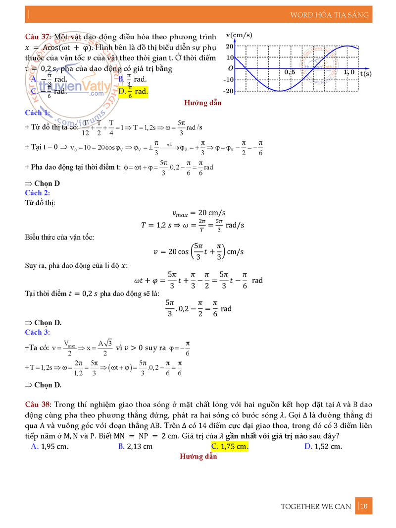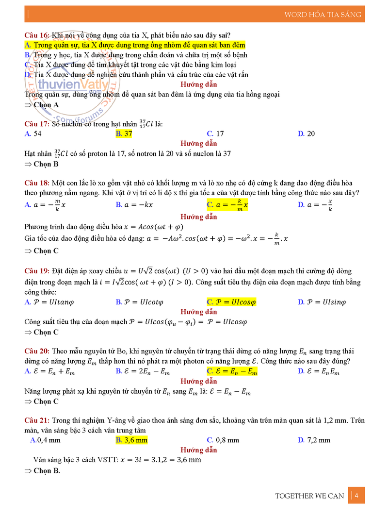 Đáp án tham khảm đề thi tốt nghiệp THPT năm 2020 môn Vật Lý mã đề 219. Nguồn: Word Hóa Tia Sáng