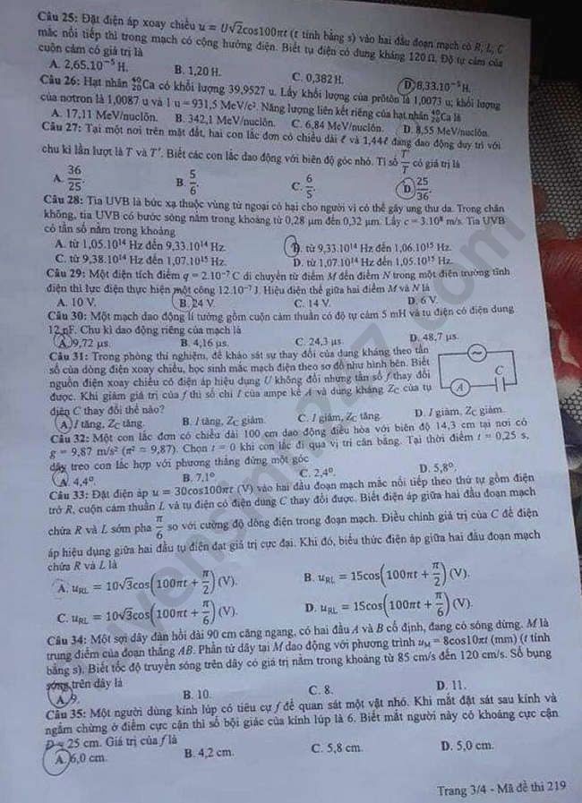 Đề thi tốt nghiệp THPT năm 2020 môn Lý mã đề 219. Nguồn: TTHN