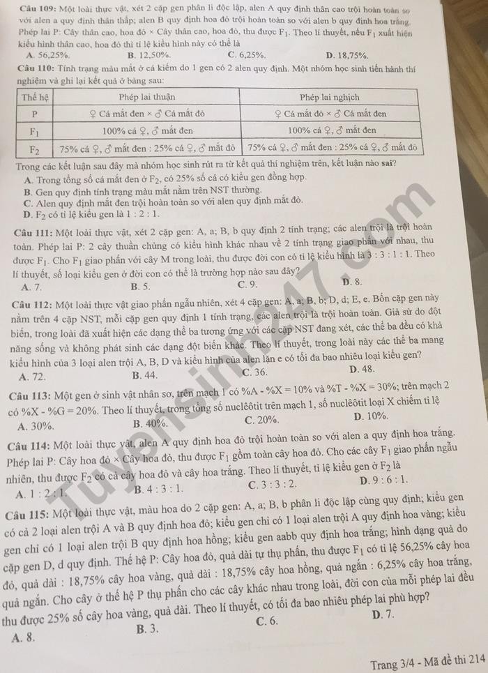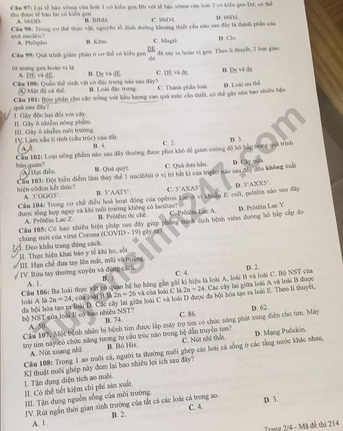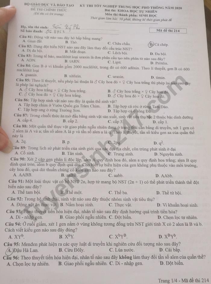 Đề thi tốt nghiệp THPT năm 2020 môn Sinh học mã đề 214. Nguồn: TTHN