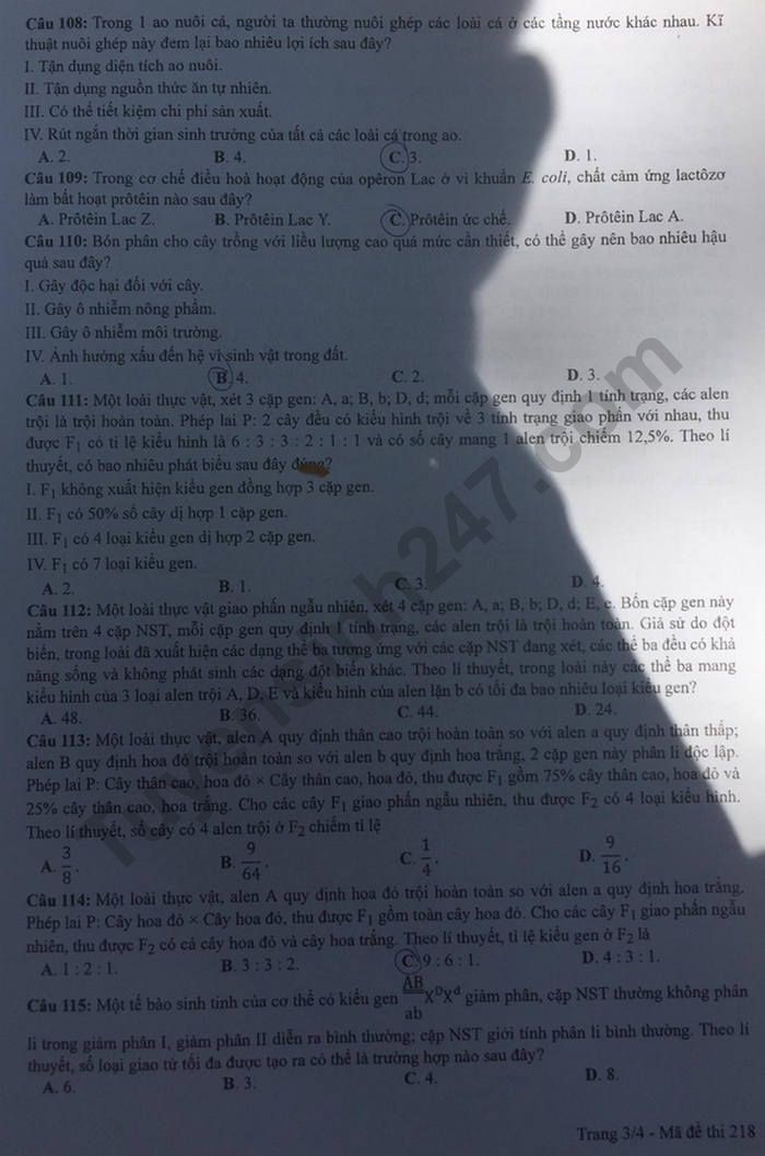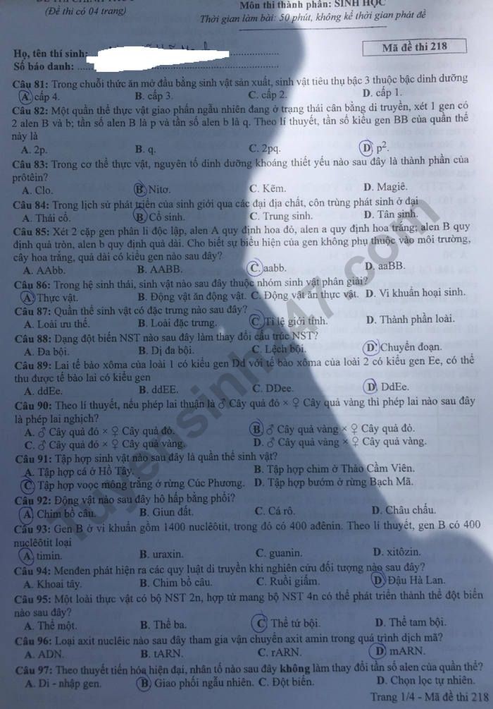 VietTimes cập nhật đề thi và đáp án tham khảo đề thi tốt nghiệp THPT năm 2020 môn Sinh học mã đề 218