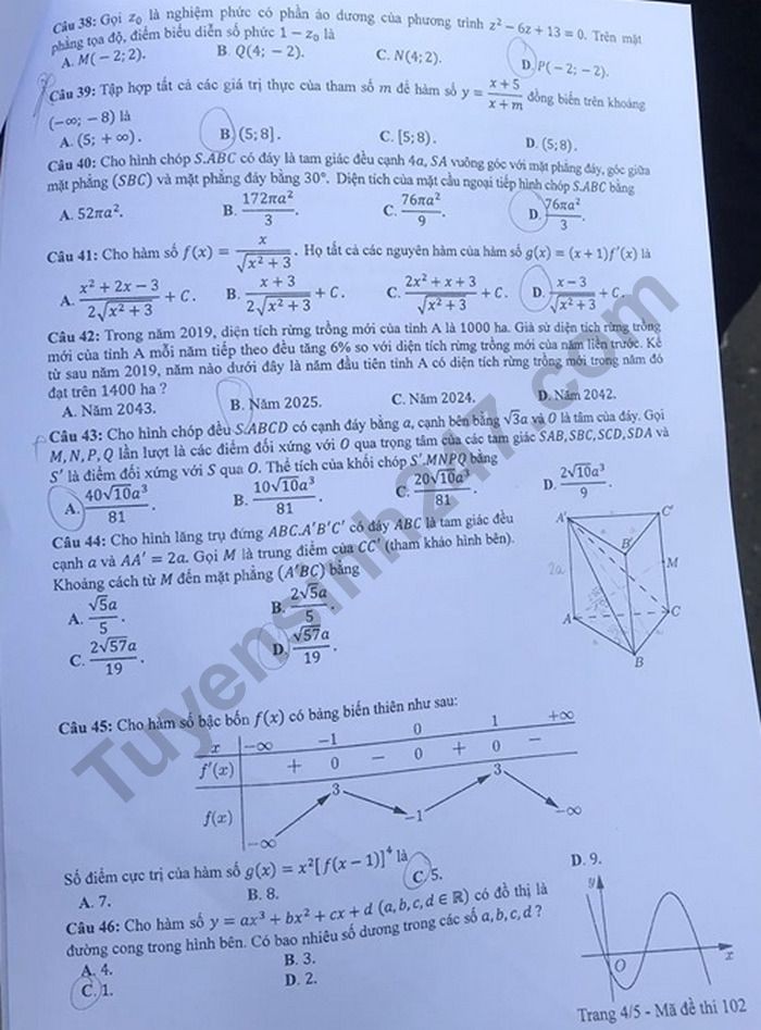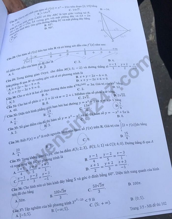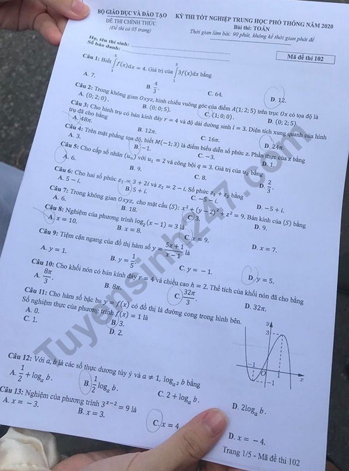 Đề thi tốt nghiệp THPT năm 2020 môn Toán mã đề 102. Nguồn: TTHN