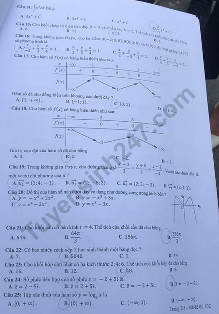 Đề thi tốt nghiệp THPT môn Toán 2020 - Tất cả mã đề gồm: 101, 102, 103, 104, 105, 106, 107, 108, 109, 110, 111, 112, 113, 114, 115, 116, 117, 118, 119, 120, 121, 122, 123, 124