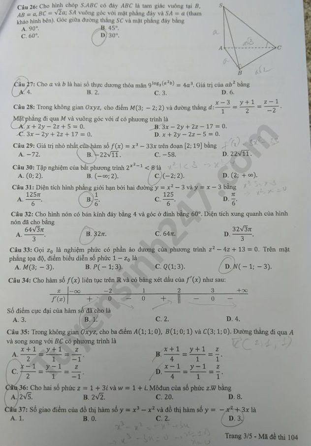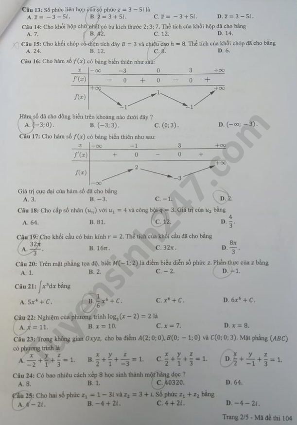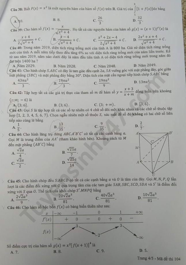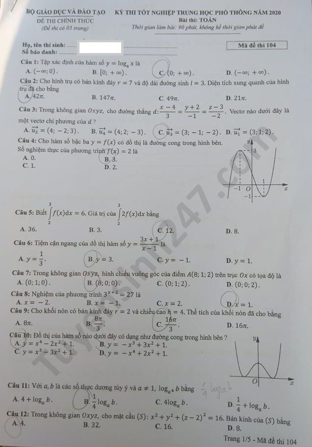 Đề thi tốt nghiệp THPT năm 2020 môn Toán mã đề 104. Nguồn: TTHN