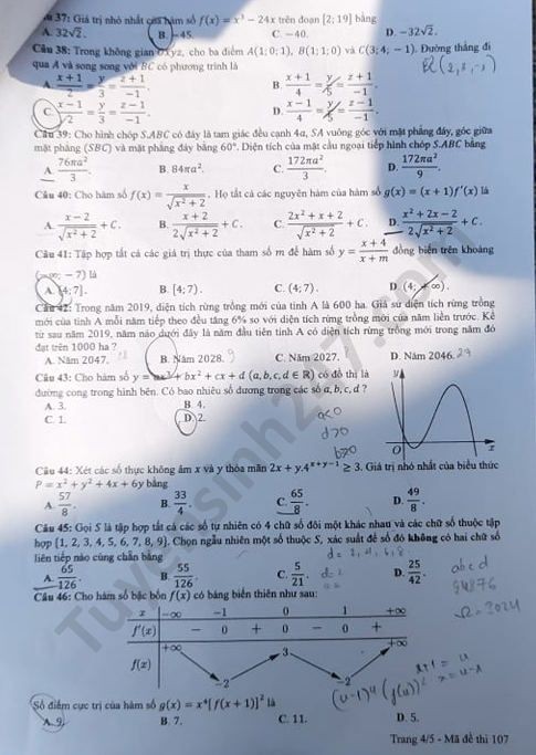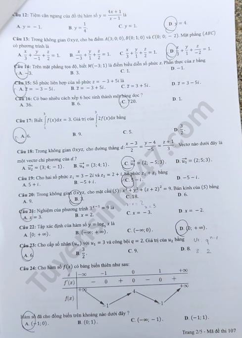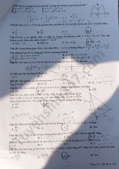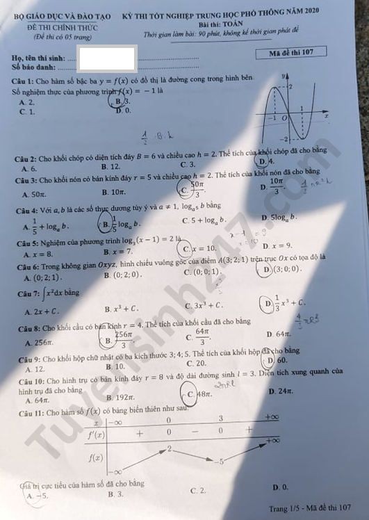 Tra cứu online đáp án đề thi THPT môn Toán 2020 mã đề 107
