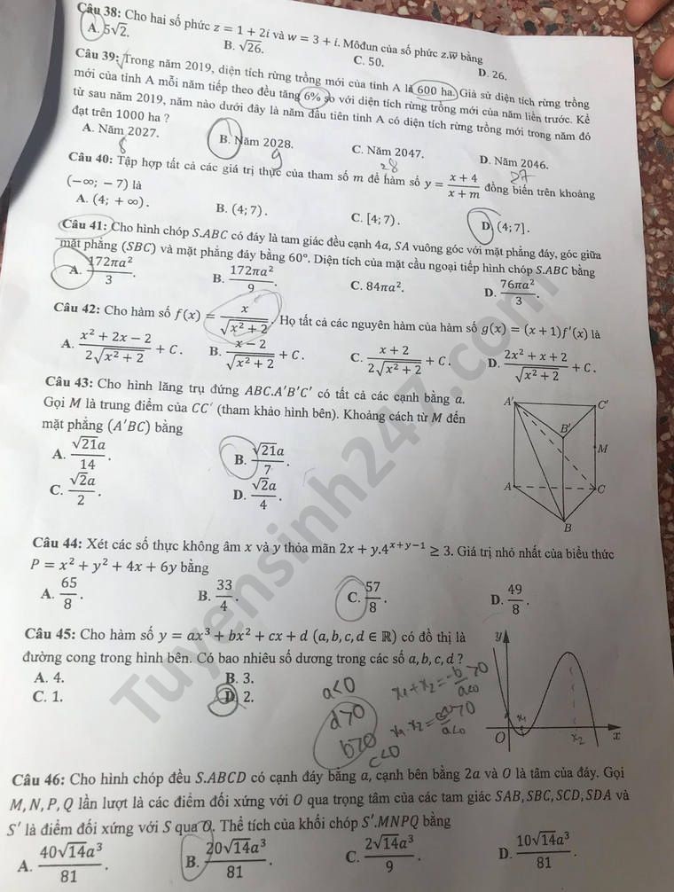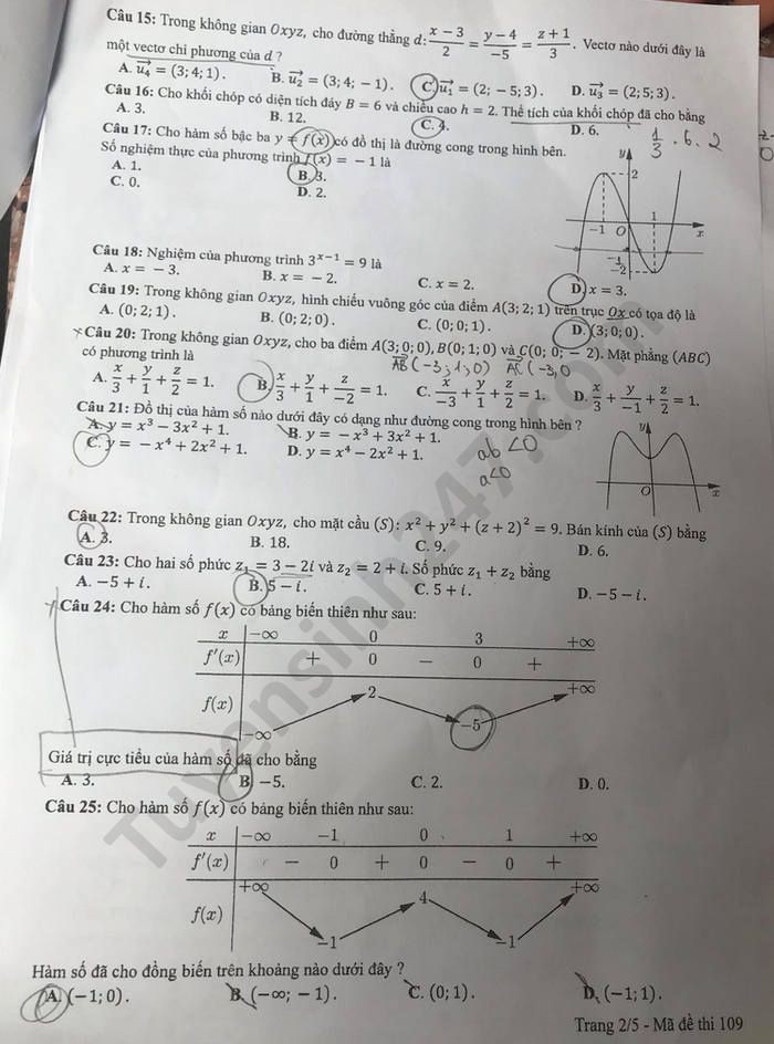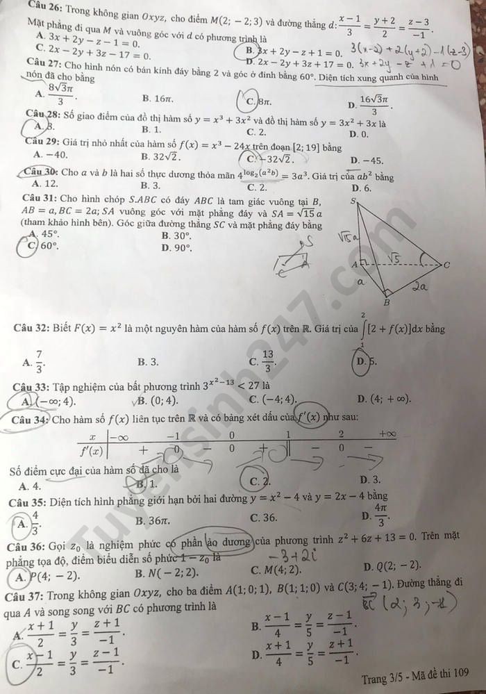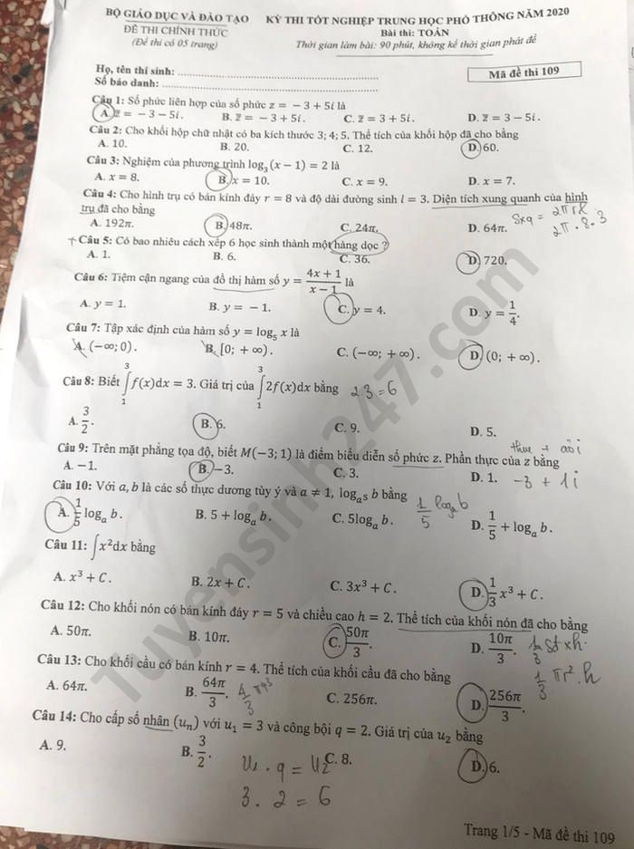Tra cứu online đáp án đề thi THPT môn Toán 2020 mã đề 109