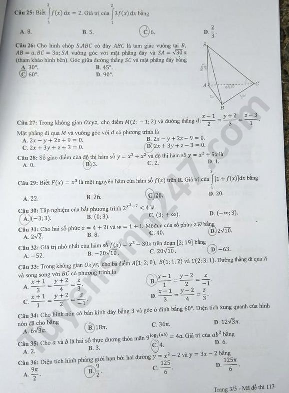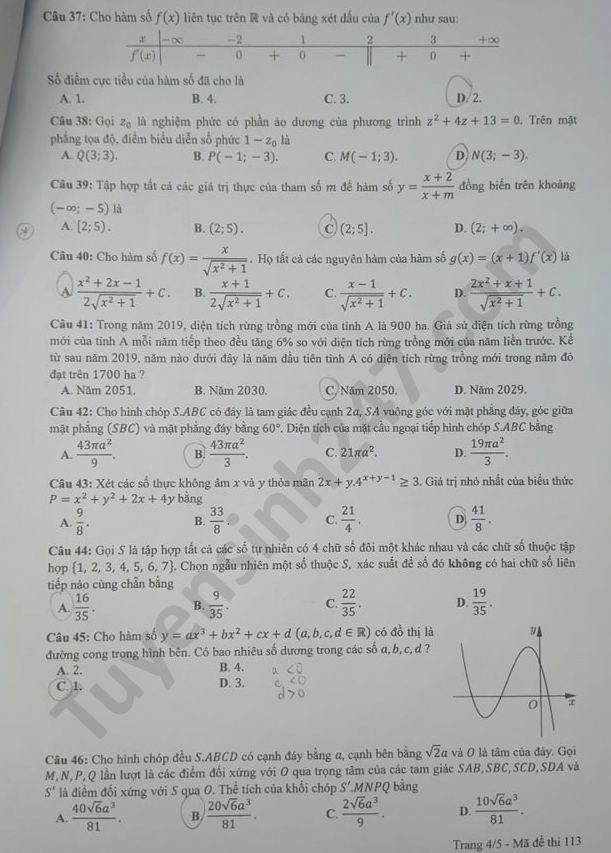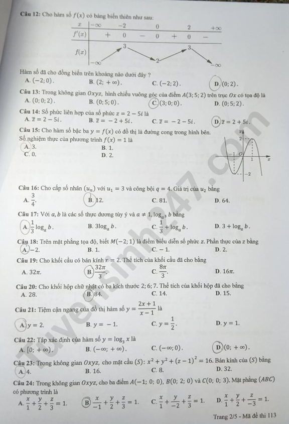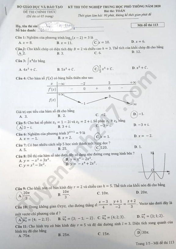 Đề thi tốt nghiệp THPT năm 2020 môn Toán mã đề 113. Nguồn: TTHN