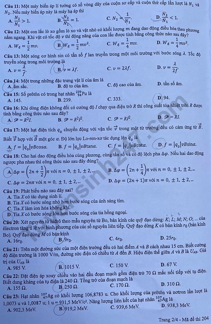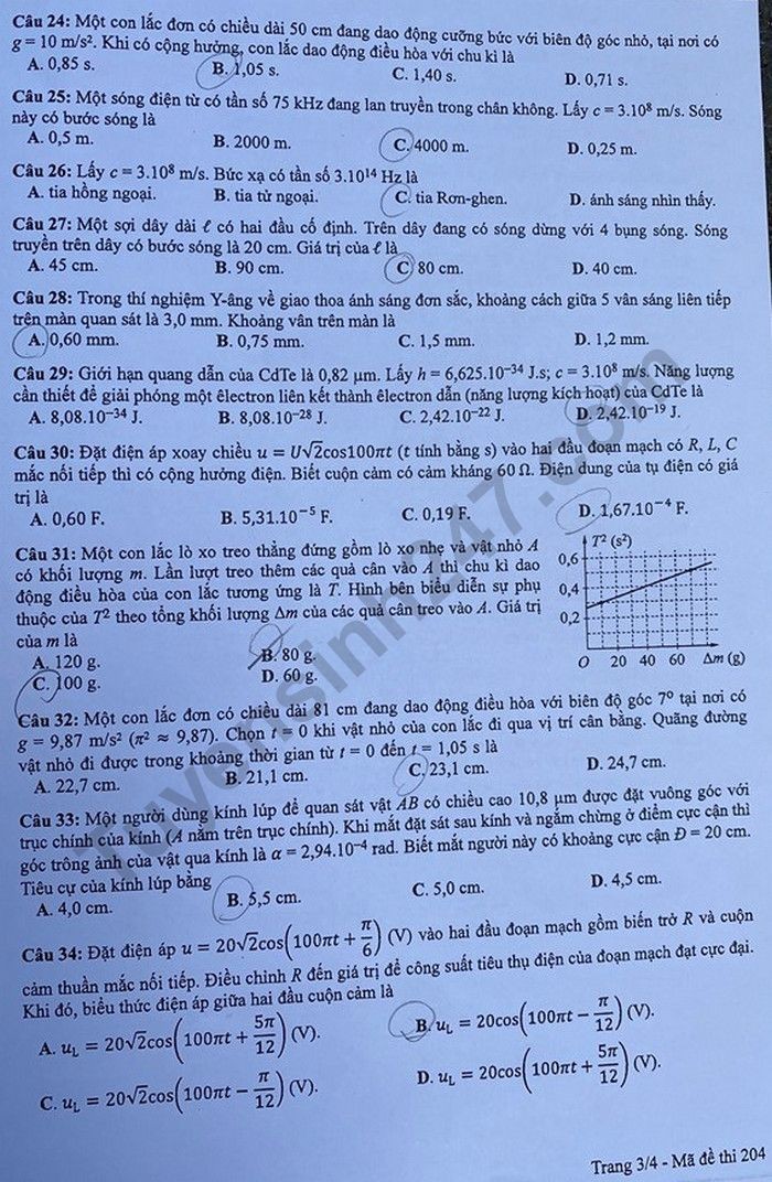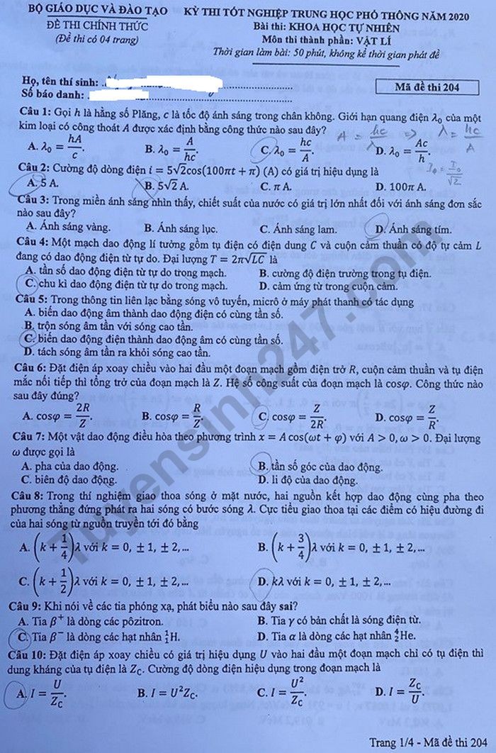 Đề thi tốt nghiệp THPT năm 2020 môn Vật Lý mã đề 204. Nguồn: TTHN