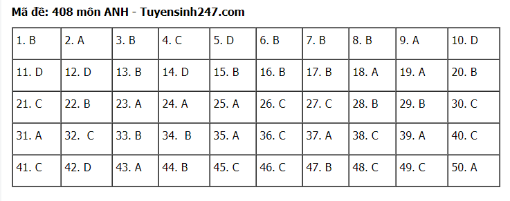Sau đây là đáp án tham khảo đề thi tốt nghiệp THPT 2020 môn tiếng Anh, mã đề 408.