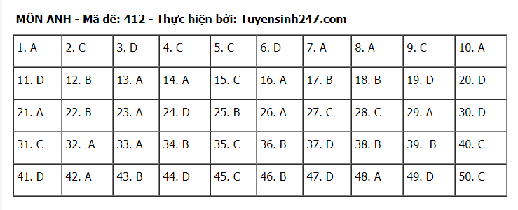Sau đây là đáp án tham khảo đề thi tốt nghiệp THPT 2020 môn tiếng Anh, mã đề 412.