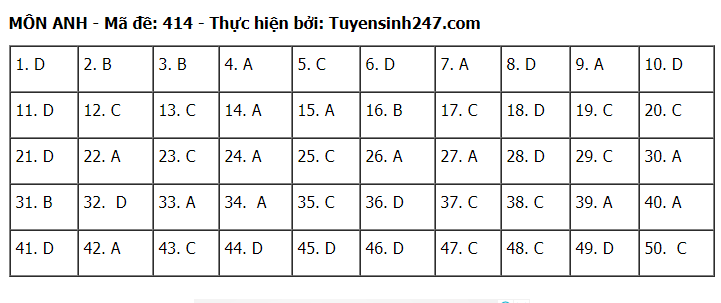 Sau đây là đáp án tham khảo đề thi tốt nghiệp THPT 2020 môn tiếng Anh, mã đề 414.