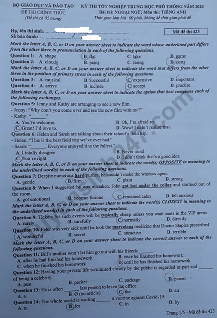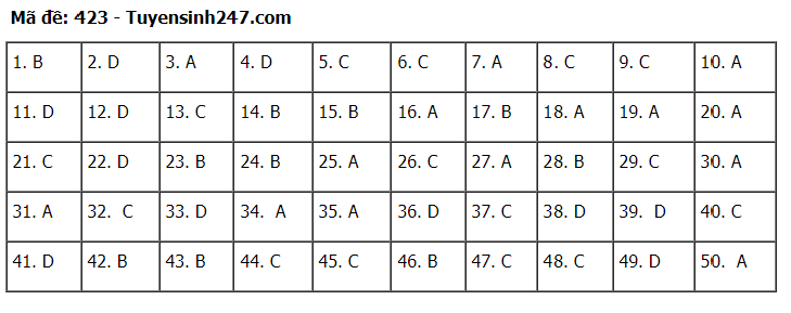 Sau đây là đáp án tham khảo đề thi tốt nghiệp THPT 2020 môn tiếng Anh, mã đề 423.