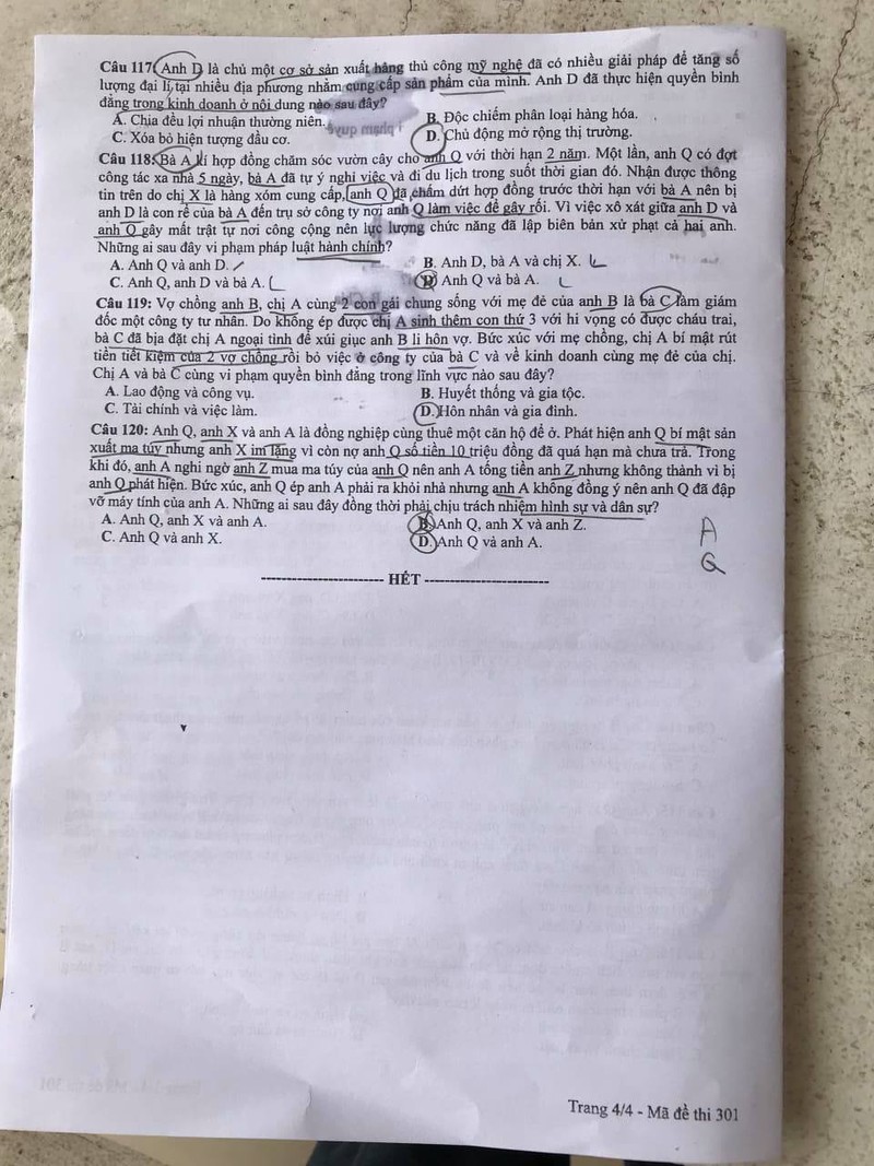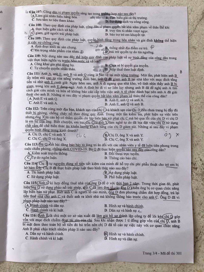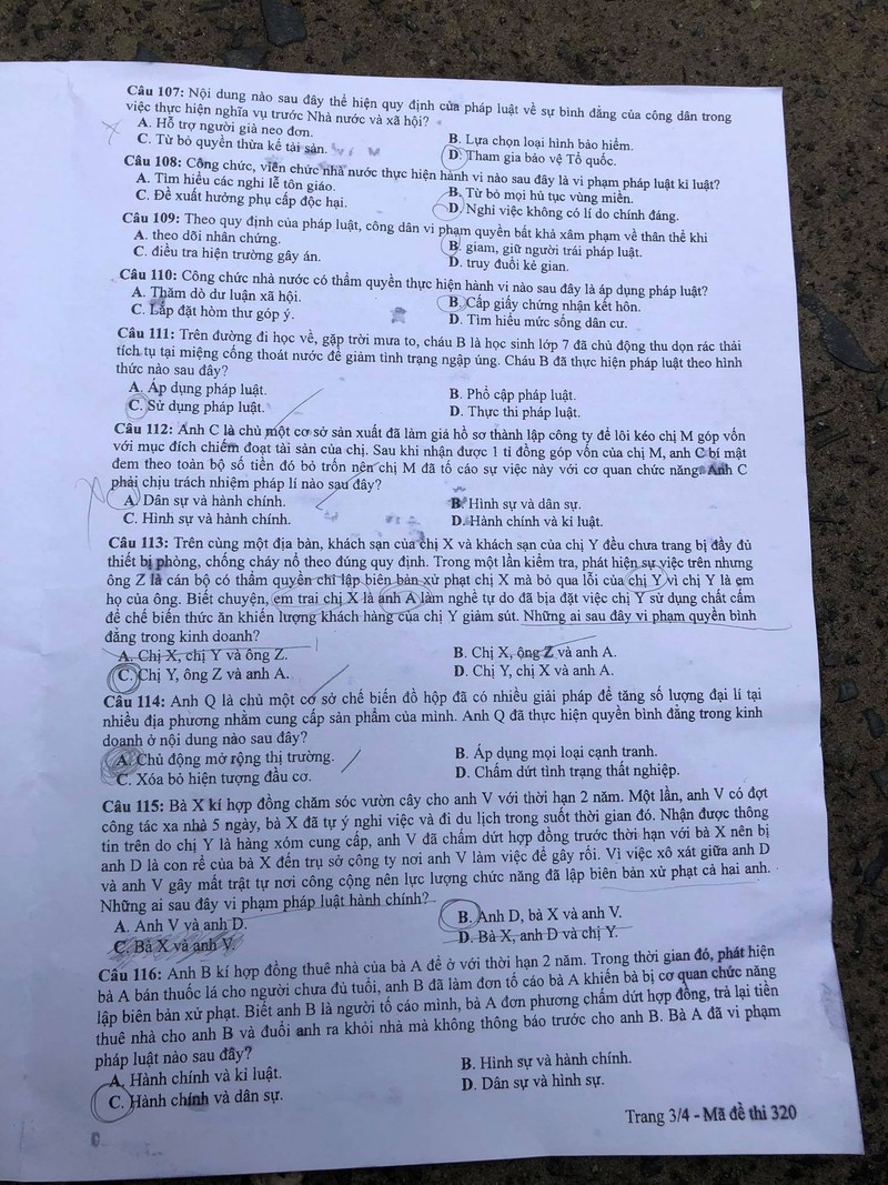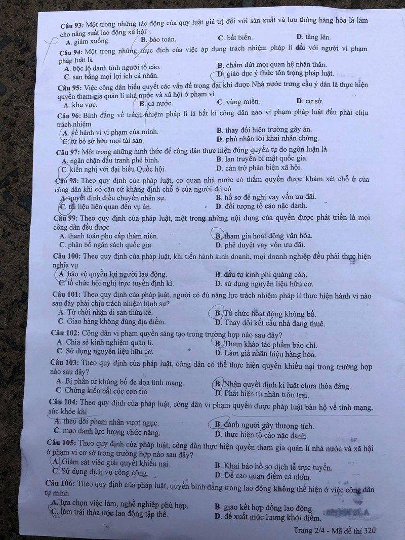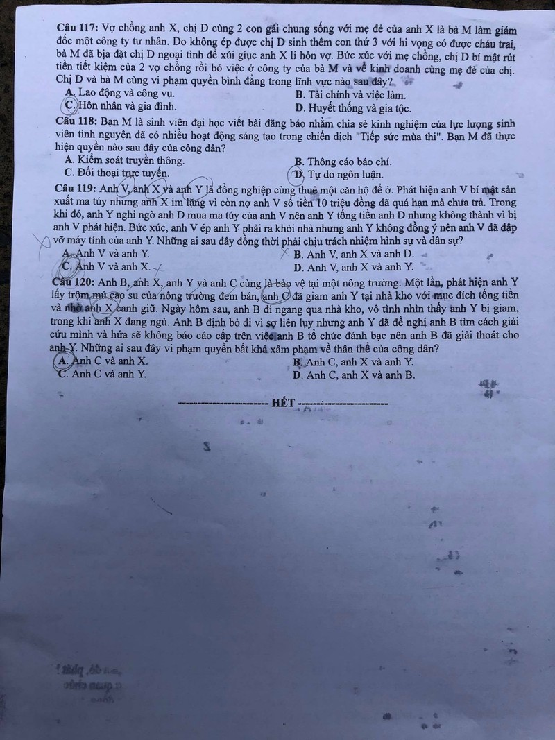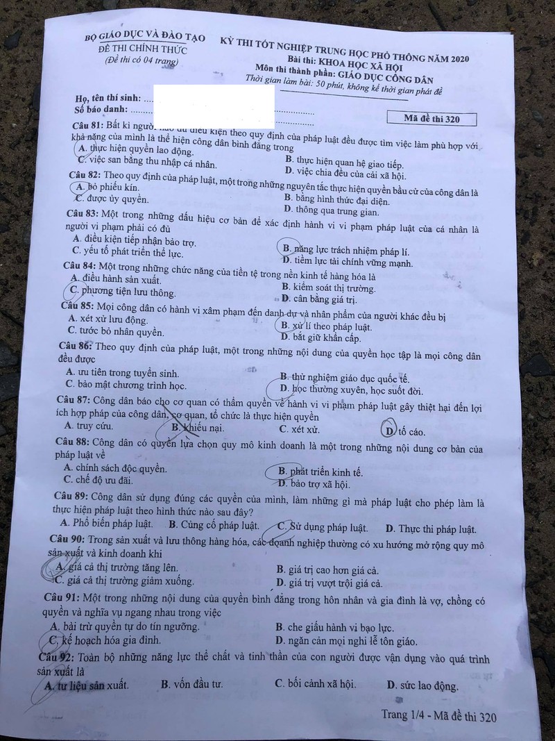 Lưu ý đáp án khoanh trong đề thi là của thí sinh, không phải đáp án tham khảo.