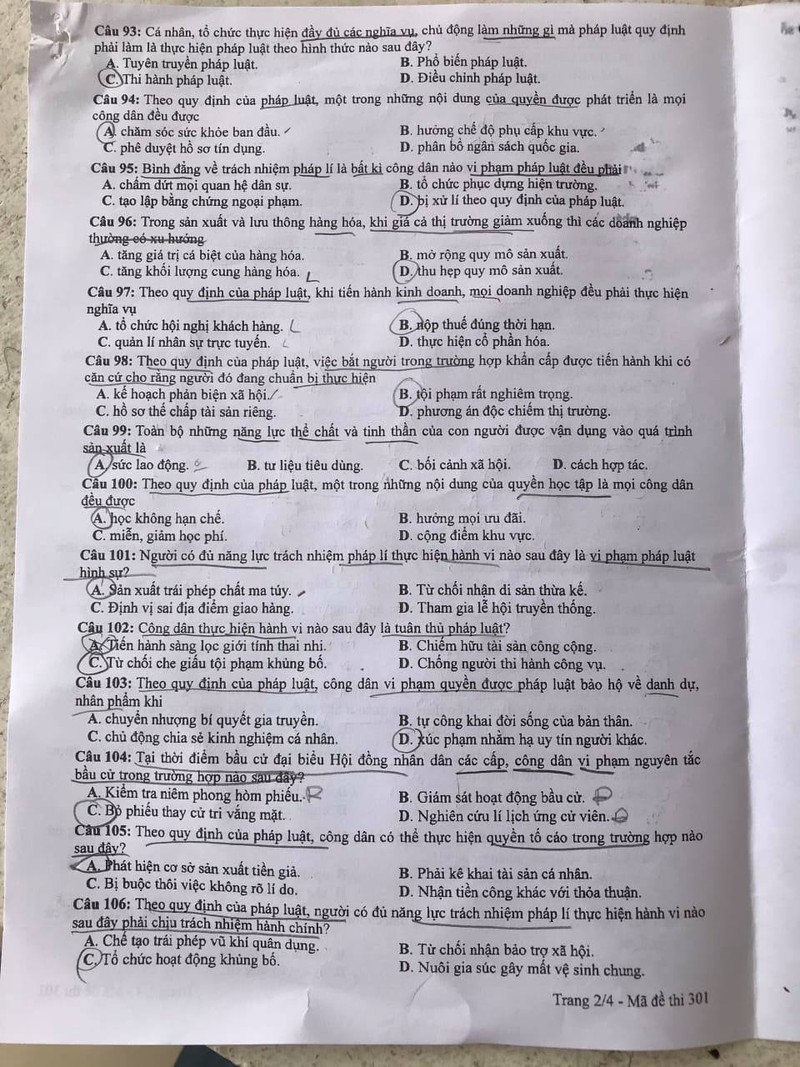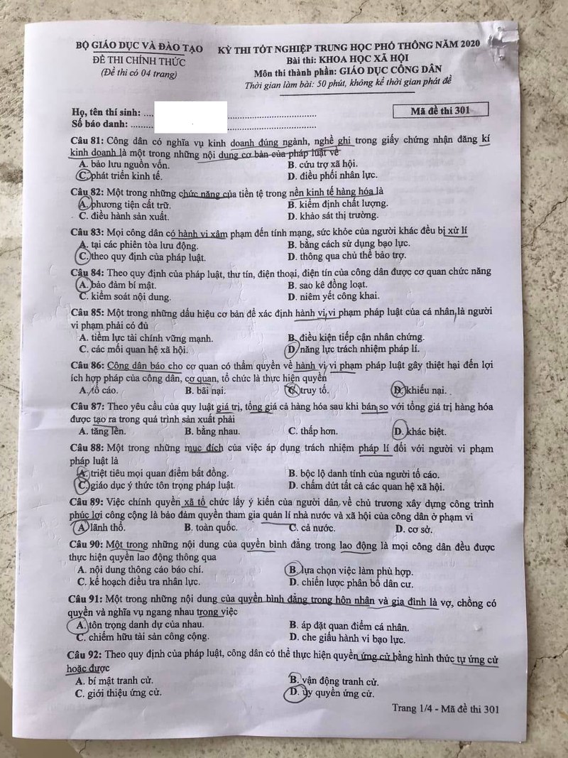 Đề thi THPT 2020 môn Giáo dục công dân mã đề thi 301
