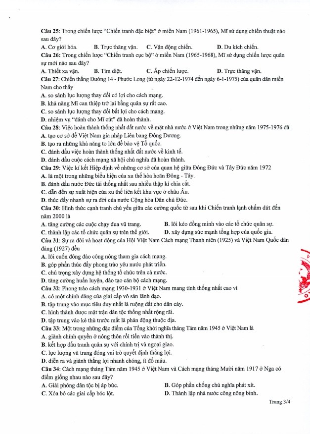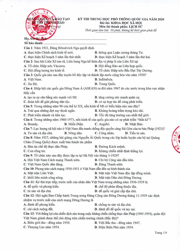 Đề thi tốt nghiệp THPT năm 2020 môn Lịch Sử.