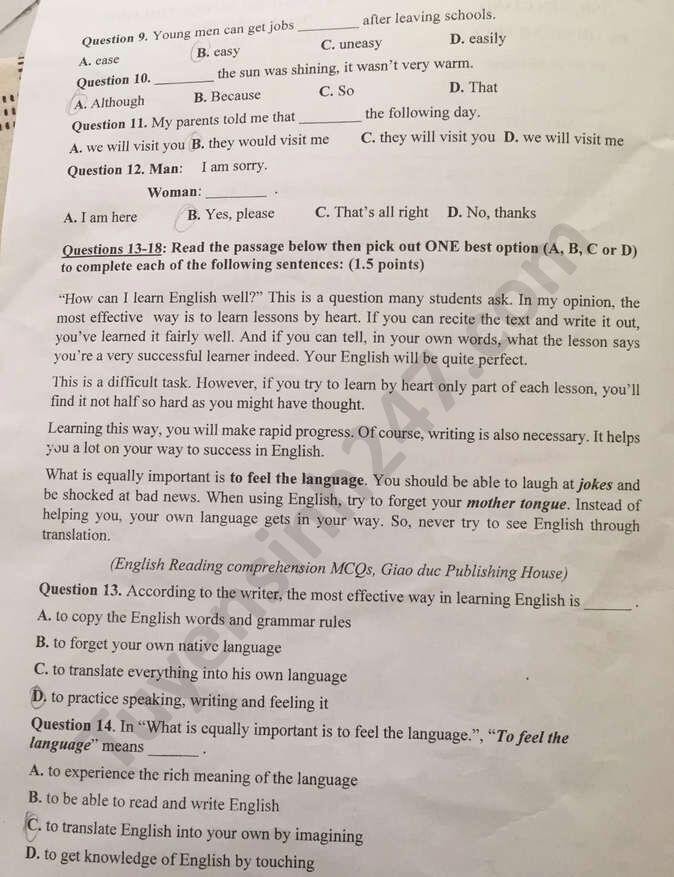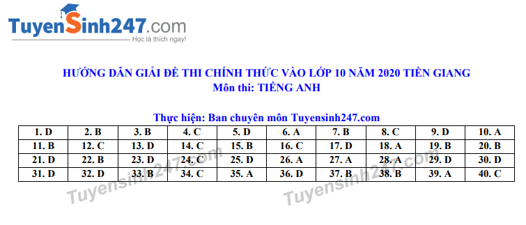 Đáp án tham khảo đề thi vào lớp 10 môn tiếng anh tỉnh Tiền Giang năm 2020: