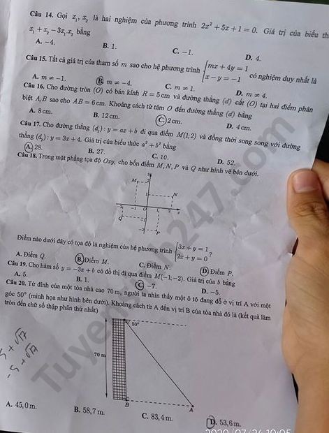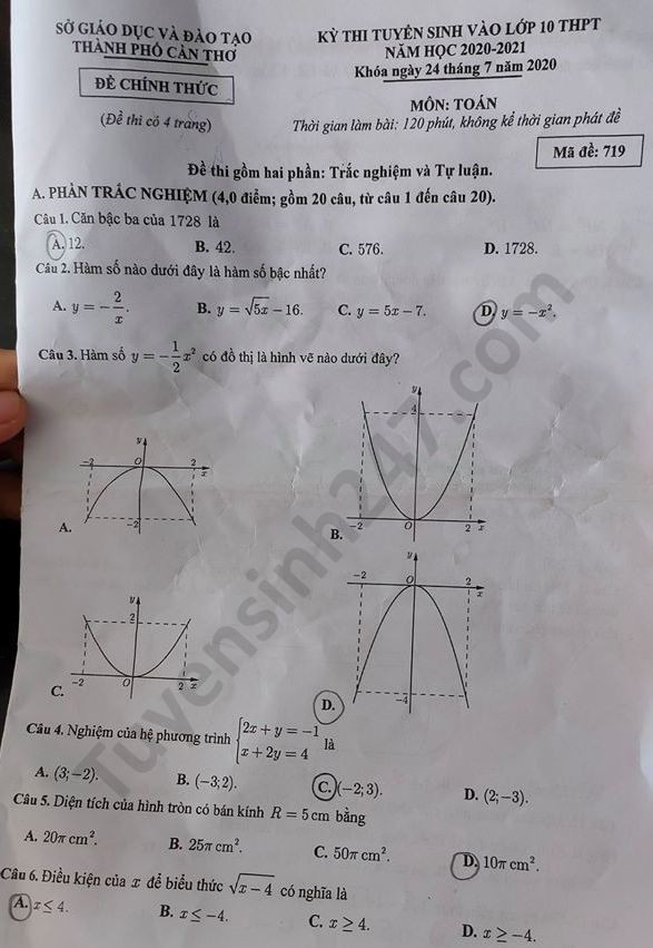 Đề thi tuyển sinh vào lớp 10 môn Toán TP Cần Thơ năm 2020. Nguồn: TTHN