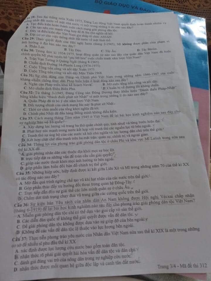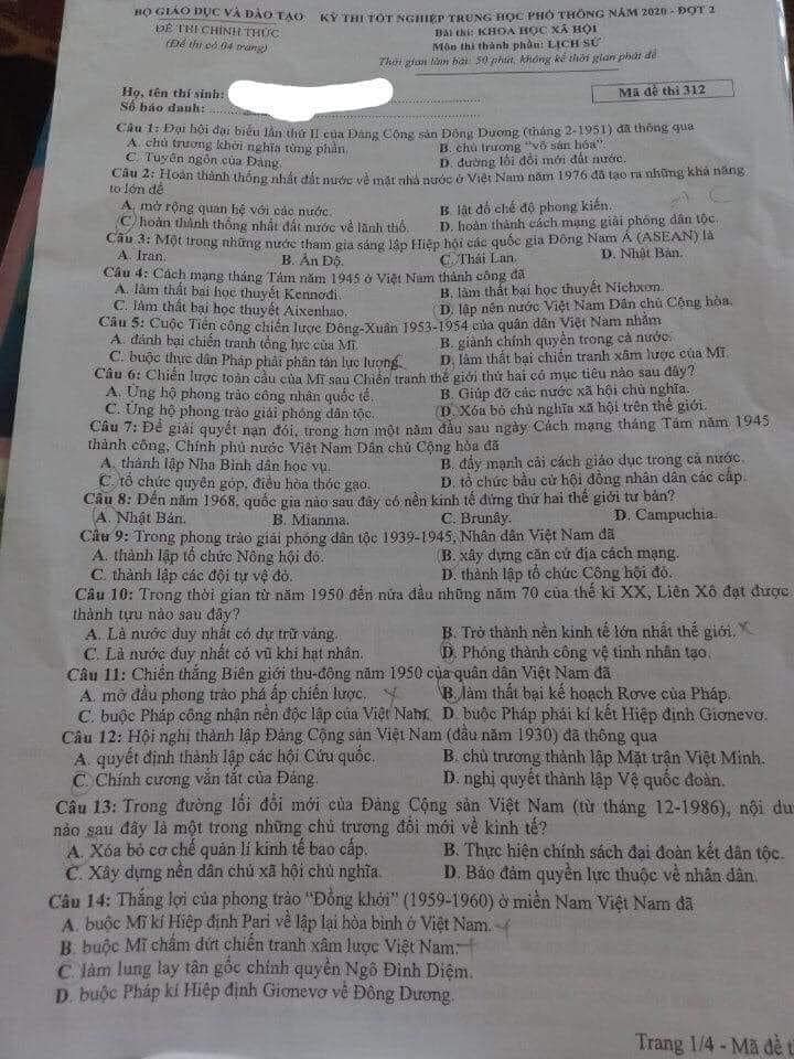 Cập nhật đề thi Lịch sử tốt nghiệp THPT 2020 đợt 2, mã đề 312.