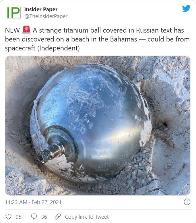 Một trái bóng titan, được tin là một phần của tàu không gian do Nga chế tạo, mới được phát hiện trên một bãi biển ở Bahamas; theo tờ The Independent. Vật thể này được phát hiện bởi một công dân Anh tên là Manon Clarke.