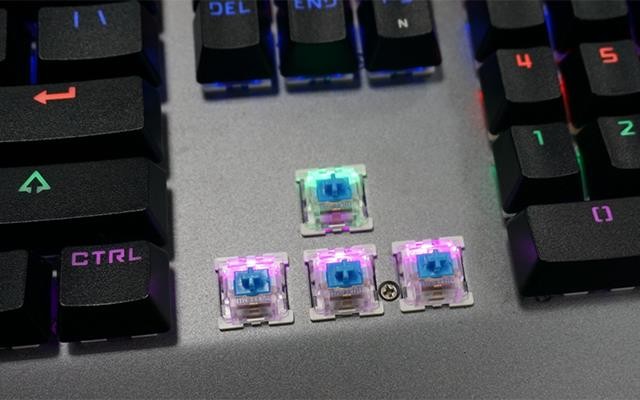 Các phím trên GT-03K được thiết kế theo dạng lộ switch và keycap lên trên để ánh sáng tỏa ra đẹp hơn. Nhược điểm thì sẽ mau bám bụi nhưng vệ sinh cũng dễ dàng. Một điểm mà ngay đến các hãng nổi tiếng cũng ít khi làm đó là trang bị keycap doubleshot. Tuy lớp thứ hai trong keycap của GT-03K hơi mỏng nhưng dù sao vẫn là một lợi thế của chiếc bàn phím này so với các sản phẩm cùng phân khúc. Blue switch của Outemu cho cảm giác gõ khá ổn, không bị sượng.