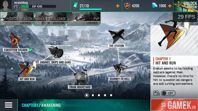 Sau màn chơi hướng dẫn cơ bản ban đầu, giao diện chính FZ9 hiện ra và tôi cũng phần nào nhận thấy đây là một tựa game hình thành theo hướng Free to Play. Theo đó, game chia ra thành nhiều nhiệm vụ trong các màn chơi và mỗi lần tham gia bạn cần bỏ ra điểm thể lực cần thiết. Bên cạnh đó, để tăng thêm phần thú vị thì hãng phát triển còn thêm vào hệ thống nâng cấp khả năng chiến đấu khác nhau. Tuy nhiên chúng lại đòi hỏi điểm kinh nghiệm bạn nhận được sau mỗi màn chơi và đây cũng không phải là chuyện một sớm một chiều có thể mở khóa được điểm cần thiết.