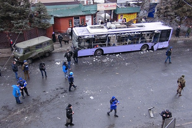 Những nhân chứng nói rằng trạm đỗ xe buýt bị pháo kích bằng súng cối. "Có khoảng năm tiếng nổ liên tiếp, tương tự như đạn cối," – một nhân chứng kể lại với cơ quan truyền thông địa phương Donetsk. Vài giờ sau sau, một trong những lãnh đạo của DNR tuyên bố ở Donetsk đã bắt giữ một tốp người phá hoại ngầm, được cho là đã bắn phá trạm đỗ xe buýt.