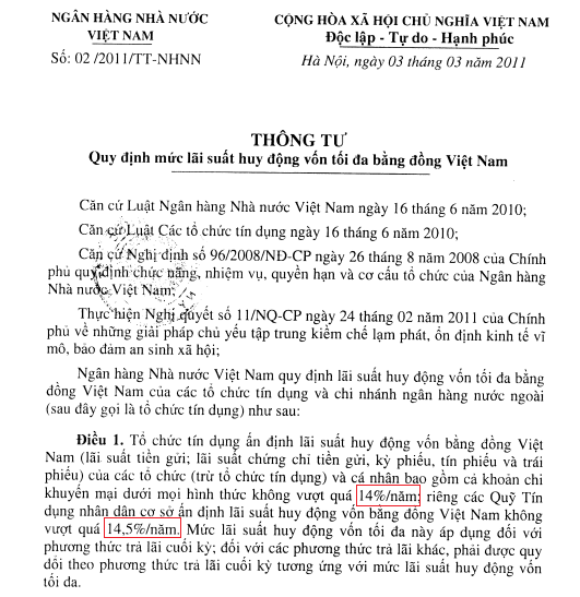 Trước cơn say đua lãi của cácTCTD, cực chẳng đã, NHNN đã phải ban hành Thông tư số 02/2011/TT-NHNN quy định lãi suất huy động vốn tối đa bằng đồng Việt Nam của các tổ chức tín dụng và chi nhánh ngân hàng nước ngoài. “Barie” được chốt ở mức 14%; có nghĩa các ngân hàng thoải mái huy động vốn ở mức 14%/năm và lãi suất cho vay, tất nhiên, phải được cộng thêm tối thiểu 4 – 5% nữa.