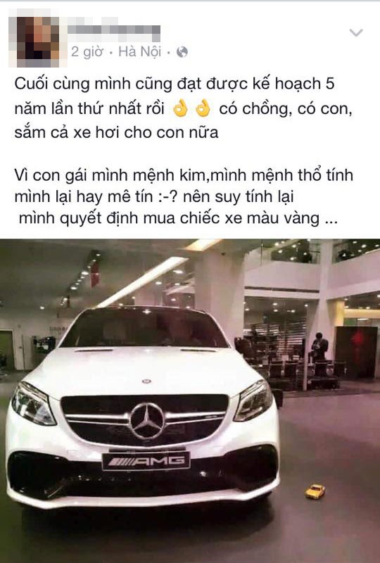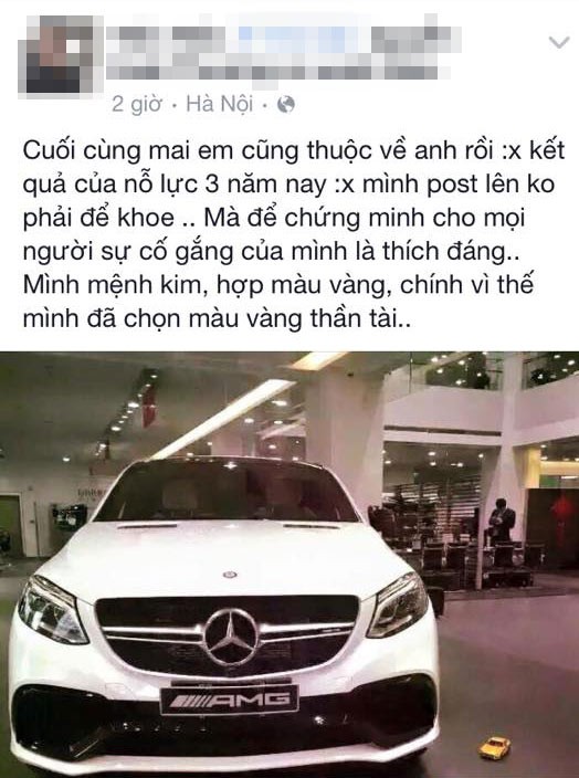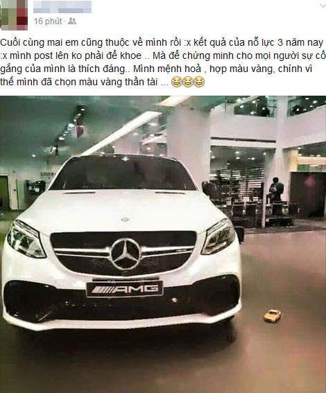 Mới đây, hình ảnh chiếc xe ôtô hiệu Mercedes bên cạnh chiếc xe ôtô đồ chơi nhỏ xíu, màu vàng được rất nhiều thành viên mạng nhận là của mình, kèm theo đó là dòng status: