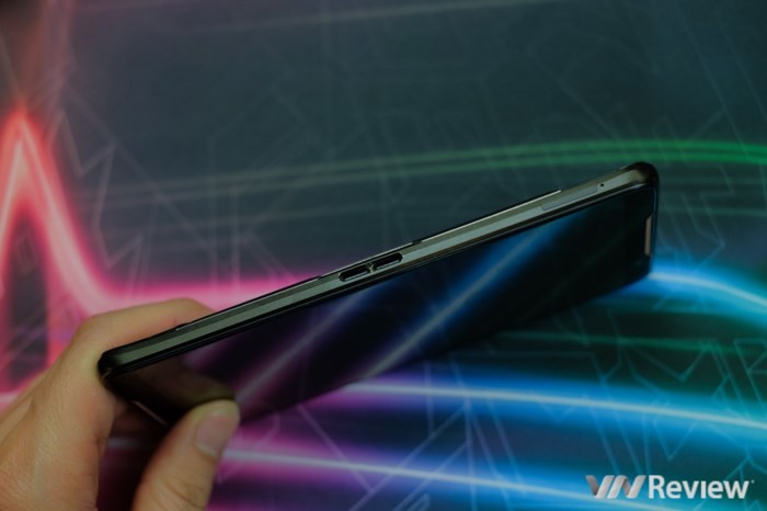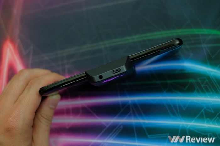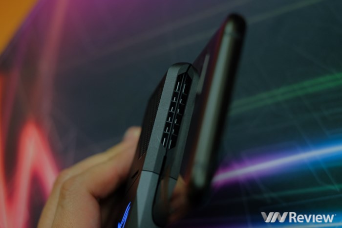 Ở hông, máy có một cổng riêng để kết nối với phụ kiện. Nhà sản xuất tặng kèm một bộ tản nhiệt để gắn vào đây, có quạt gió để đẩy khí nóng sang hai bên. Phần đáy tản nhiệt còn có cổng USB Type C, cho phép cắm sạc ngang thân máy, bớt vướng khi đang cầm chơi game. Bản thân ROG Phone cũng được trang bị cổng USB Type C hỗ trợ sạc nhanh và vẫn giữ lại cổng âm thanh 3.5mm truyền thống.