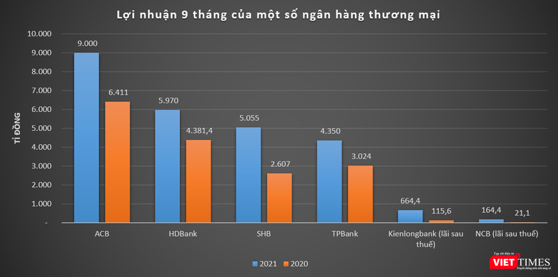 Với Kienlongbank, nhà băng này ghi nhận lợi nhuận sau thuế 9 tháng đầu năm đạt 664,4 tỉ đồng, gấp 6 cùng kỳ năm trước. Trong 9 tháng đầu năm, thu nhập lãi thuần của Kienlongbank tăng hơn 90% so với cùng kỳ, đạt 1.517,5 tỉ đồng.
