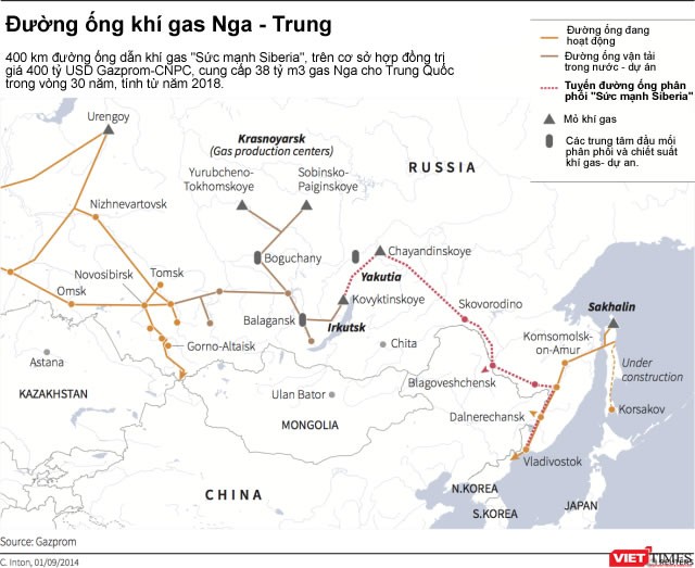 Hai năm trước, Nga công bố chính sách quay trọng tâm về phía Trung Quốc . Trung tâm của sự thay đổi là hai đường ống dẫn khí đốt tự nhiên (phần lớn hơn trong hai đường chấm màu đỏ trên bản đồ 9) mà qua đó một phần năm lượng khí đốt nhập khẩu Trung Quốc chảy qua. Thỏa thuận này có một số vướng mắc, nhưng cả hai bên đã tìm được hướng tháo gỡ, tiến trình xây dựng đã bắt đầu. Ngoài ra, Trung Quốc đang dự trù một khoản ngân sách 242 tỷ USD, xây dựng tuyến đường sắt cao tốc 4.300 từ Bắc Kinh đến Moscow, rút ngắn thời gian xuống còn hai ngày so với sáu ngày hiện nay trên tuyến tàu khách Mông Cổ Express.