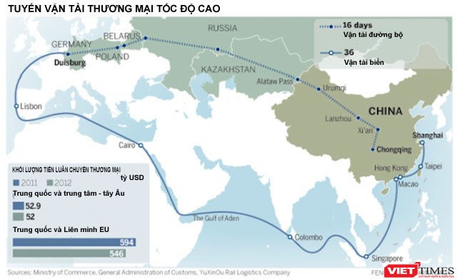 Để hình thành mạng lưới giao thông vào trung tâm châu Âu, Bắc Kinh đồng ý tài trợ tài chính cho tuyến đường sắt cao tốc dài 250 dặm với khoản kinh phí lên tới 3 tỷ USD, từ Belgrade đến Budapest. Đặc biệt, Trung Quốc sẽ xây dựng một tuyến đường sắt vận tải mới dài 8011 dặm từ Yiwu đến Madrid, gia tăng tốc độ kinh doanh nhằm thay thế vận tải đường bộ tốn nhiều thời gian bằng xe tải.