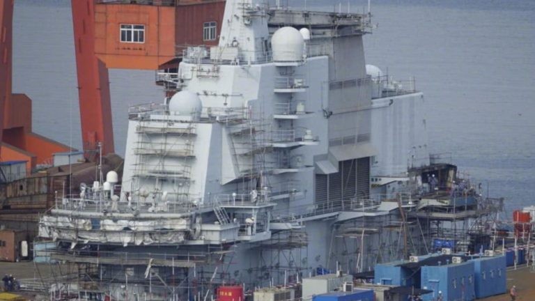 Tàu sân bay Liêu Ninh đang được nâng cấp boong thượng trung tâm điều khiển. Ảnh South Front