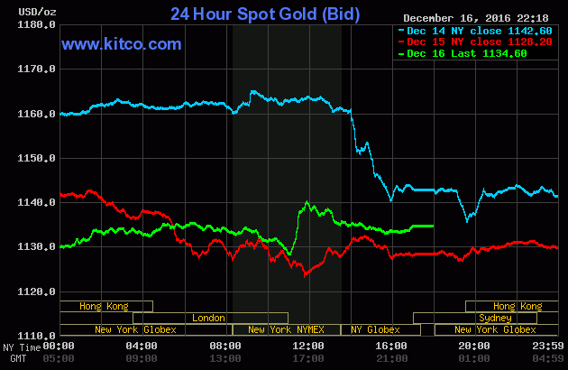 Chốt phiên giao dịch cuối tuần (Thứ Sáu ngày 16/12), giá vàng giao Tháng Hai trên sàn Comex tại Sở giao dịch New York Mercantile đảo chiều tăng mạnh $10,30 (-0,9%) xuống đóng cửa ở $1.140,10/oz. Trước đó, phiên Thứ Năm, giá vàng đã rơi xuống mức thấp nhất kể từ ngày 02/02/2016 và cũng là phiên giảm mạnh nhất kể từ ngày 11/11, căn cứ theo số liệu của Dow Jones. Tính chung cả tuần qua, vàng đã trượt giá tổng cộng 1,8%.