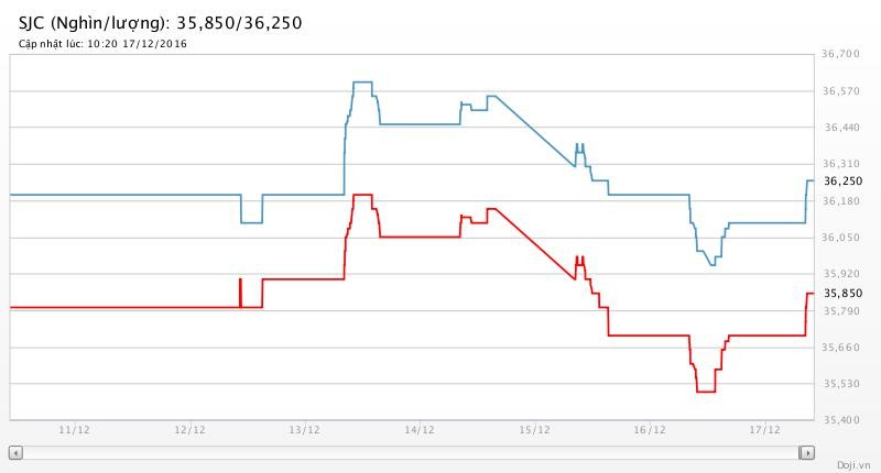 Tương tự, tại các đại lý của Doji, giá vàng miếng SJC cũng được Tập đoàn này điều chỉnh tăng 150 nghìn đồng lên niêm yết ở mức 35,85 – 36,25 triệu đồng/lượng (MV-BR) đối với giao dịch lẻ; và đắt hơn 10 nghìn đồng chiều mua, đồng thời rẻ hơn 10 nghìn đồng chiều bán đối với giao dịch buôn ở thị trường Hà Nội. Hiện, doãng chênh lệch 2 chiều mua - bán ở Doji là 400 nghìn đồng/lượng.