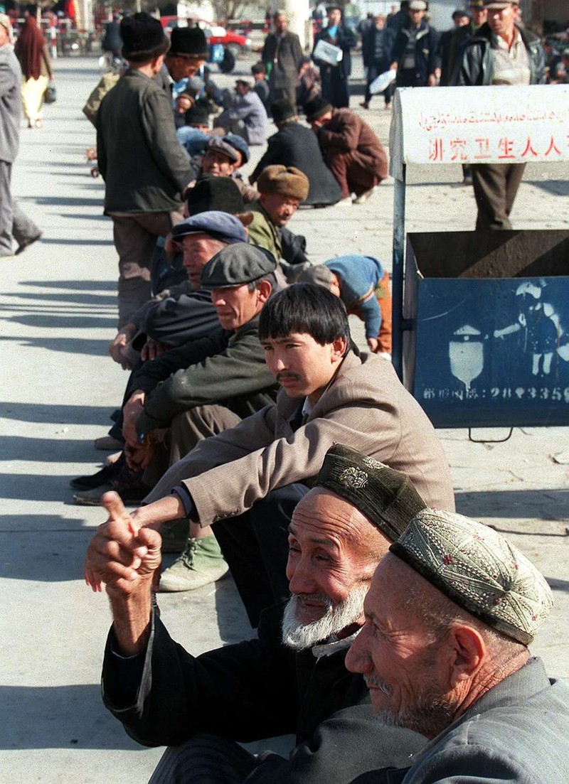 Một nhóm đàn ông Duy Ngô Nhĩ ngồi trên đường phố Kashgar. Ảnh: AFP