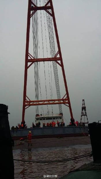 Theo Hồ Bắc Nhật Báo, tàu trục vớt đã nối dây cáp với thân tàu chìm, góc nối 30-40 độ. Dây cáp nhỏ hơn được cố định vào thân trước của tàu, trong khi cáp to được dùng để kéo lật tàu lại.