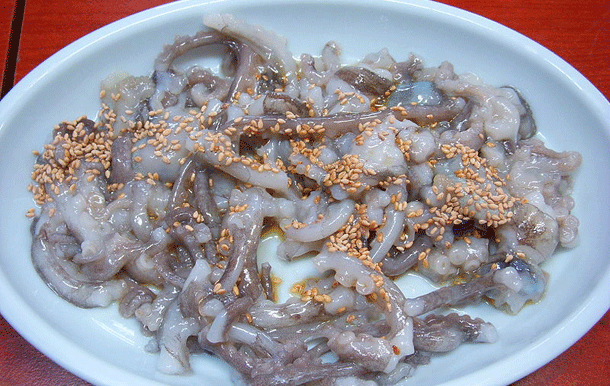 Món bạch tuộc tươi sống rất được người Nhật, Hàn Quốc ưa chuộng, trước khi ăn chỉ cần cho thêm mù tạt. Những con bạch tuộc còn sống và ngo ngoe trong đĩa đồ ăn như thế này quả thật khiến người xem phải rùng mình và không phải ai cũng đủ dũng cảm để thưởng thức món Sannakji.
