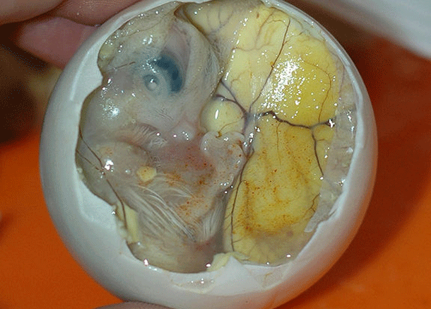 Trứng vịt ấp chưa nở được luộc lên, ăn kèm với muối ớt, rau răm. Đây được coi là món ăn khoái khẩu ở Việt Nam và một số nước thuộc khu vực Đông Nam Á. Món này người nước ngoài thường gọi là Balut.
